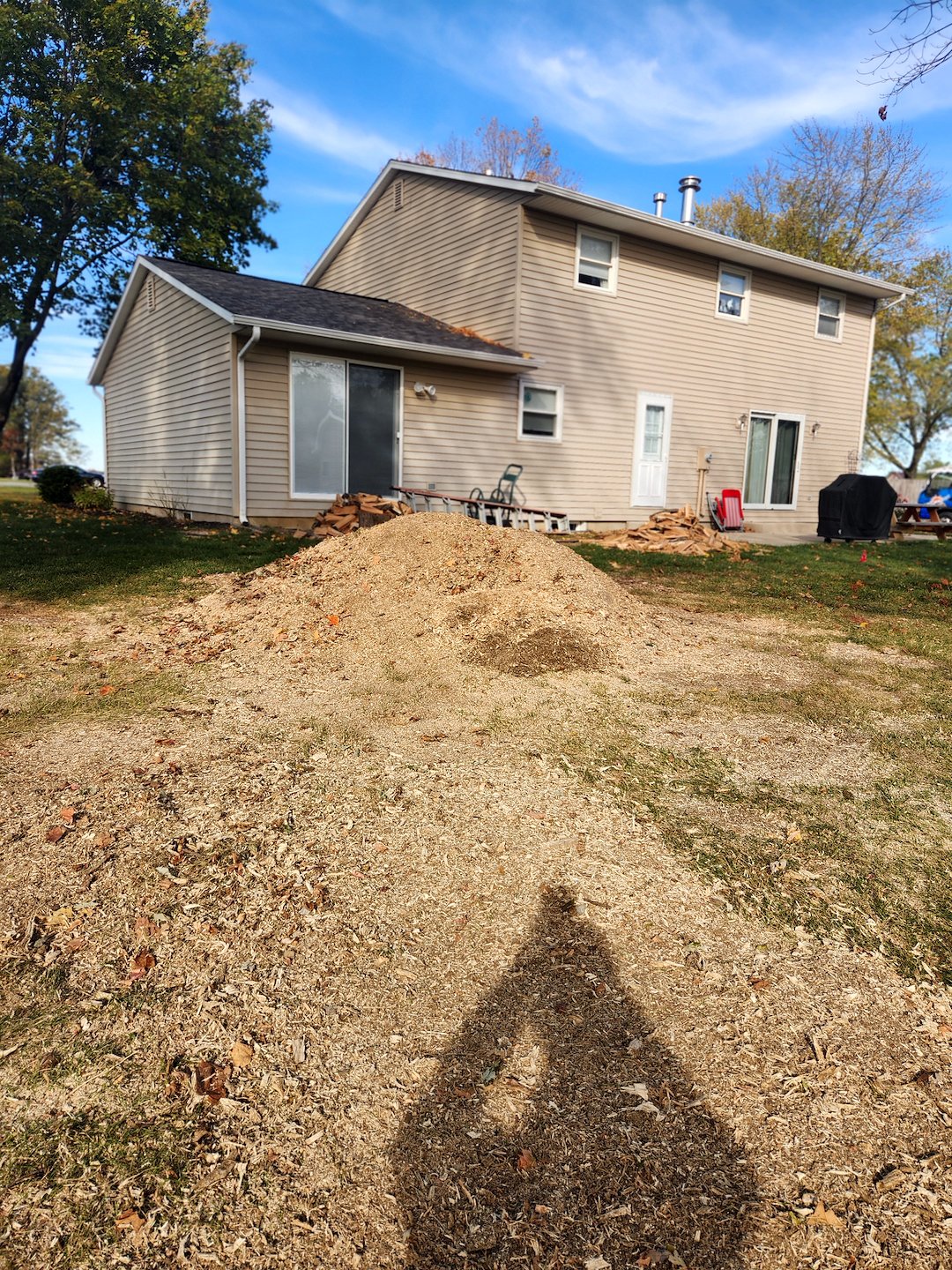 In this project, the customer chose to have the wood chips left in place to use as natural mulch. This is a popular, eco-friendly option that allows the wood to decompose over time and enrich the soil. Whether customers prefer chip removal or to repurpose them in their landscape, we always tailor our cleanup to fit their goals.