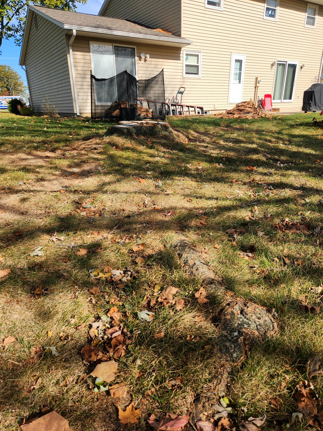 Our team recently completed a stump grinding project in Hoagland, Indiana, just outside Fort Wayne. The homeowner had multiple tree stumps in the yard that were becoming both an eyesore and a mowing obstacle. Using professional stump grinding equipment, we safely ground each stump well below grade, restoring the space for future landscaping.